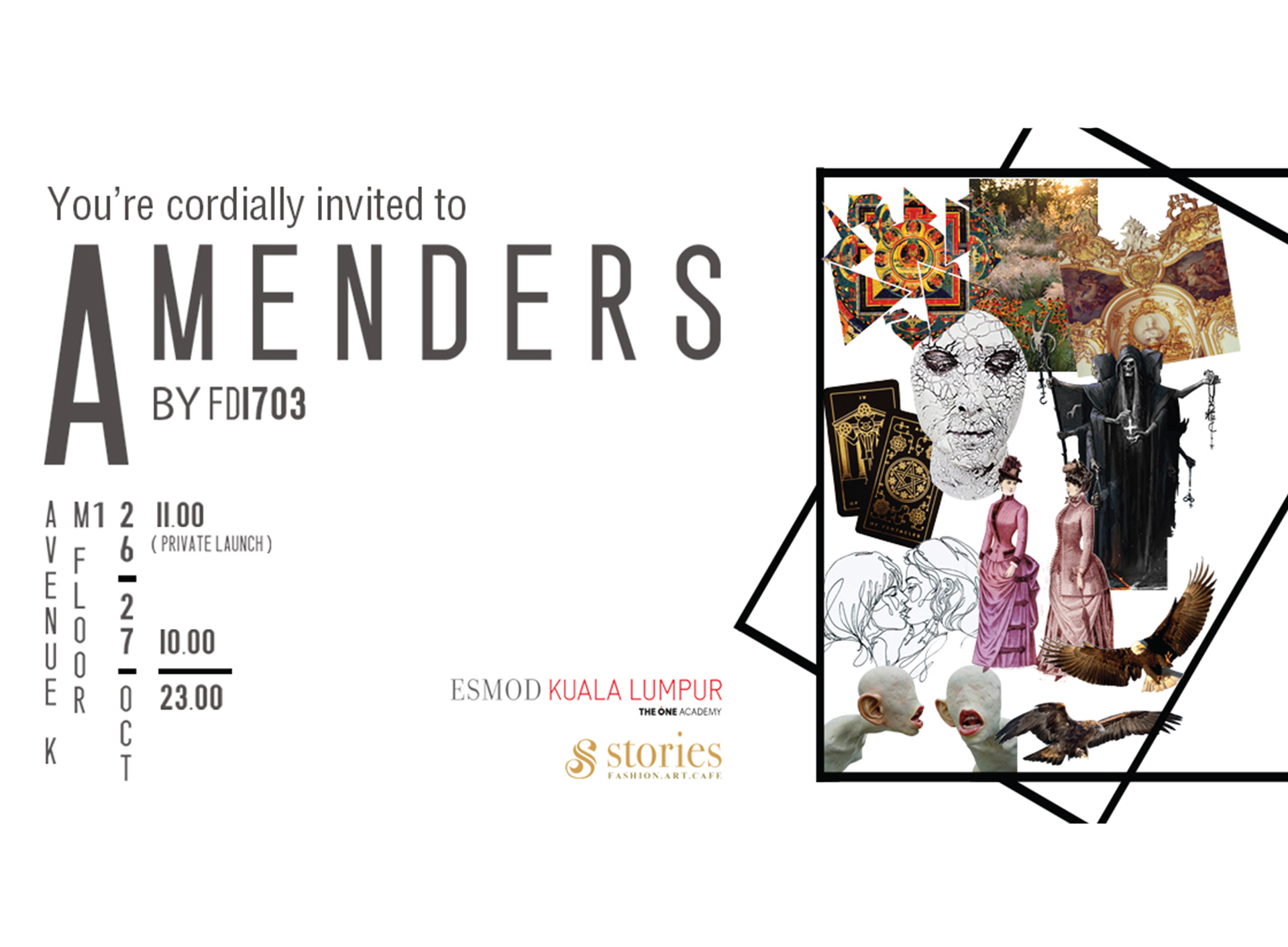 You’re cordially invited to Amenders by FD1703 Date: 26th (11am Private Launch) & 27th October Time: 10am – 11pm Venue: Avenue K