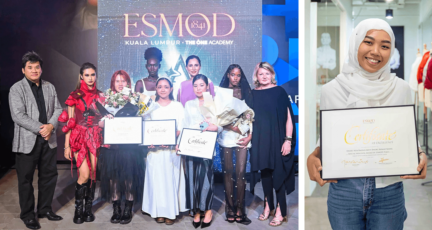 Just as the evening was about to end, Véronique Beaumont personally shared her admiration for her favorite collection of the night, 'Manic Waste' by Engku Nur Raihan. Thus, this bold and abstract ensemble, caught her eye as she specially conferred the title, “Special Mention Award by ESMOD Paris”.